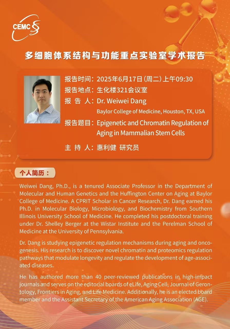 Prof.?Weiwei?Dang,?Baylor College of Medicine:?Epigenetic and Chromatin Regulation of?Aging in Mammalian Stem Cells