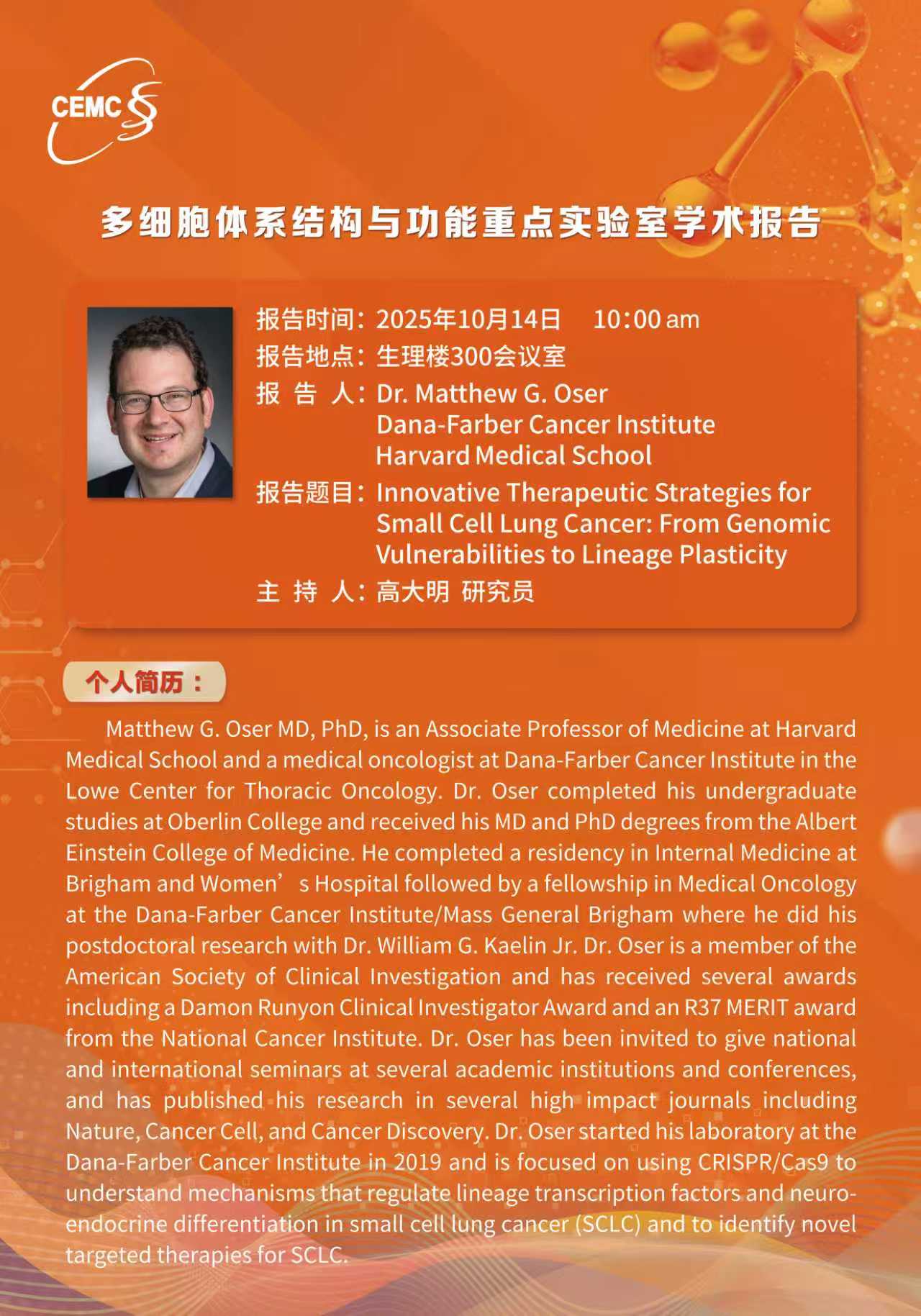 Prof. Matthew G.Oser,?Harvard?Medical School:?Innovative Therapeutic Strategies for?SmallCell Lung Cancer: From Genomic?Vulnerabilities to Lineage Plasticity