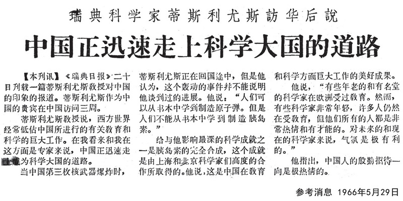 瑞典科學(xué)家蒂斯利尤斯訪華后說:中國正迅速走上科學(xué)大國的道路